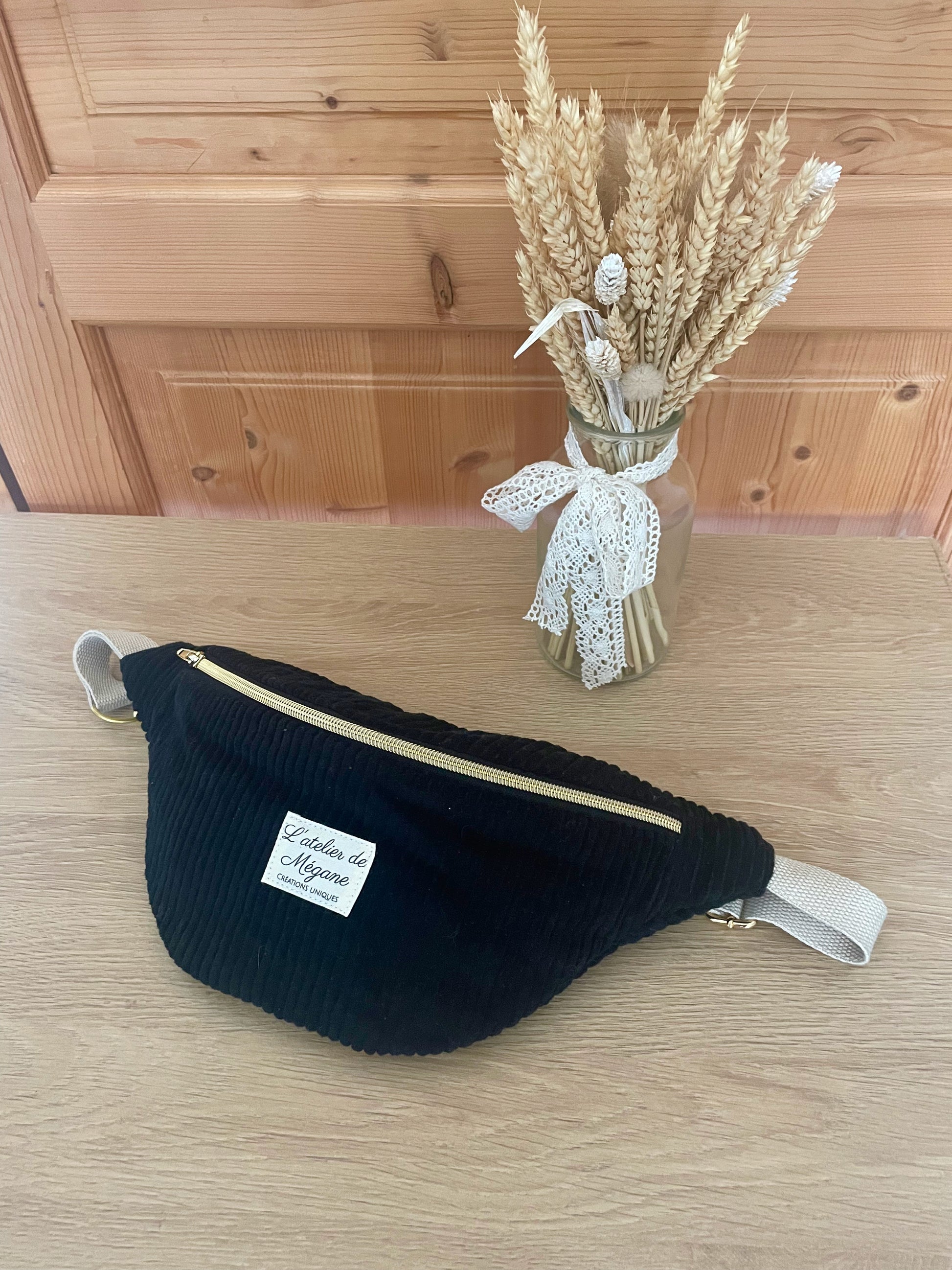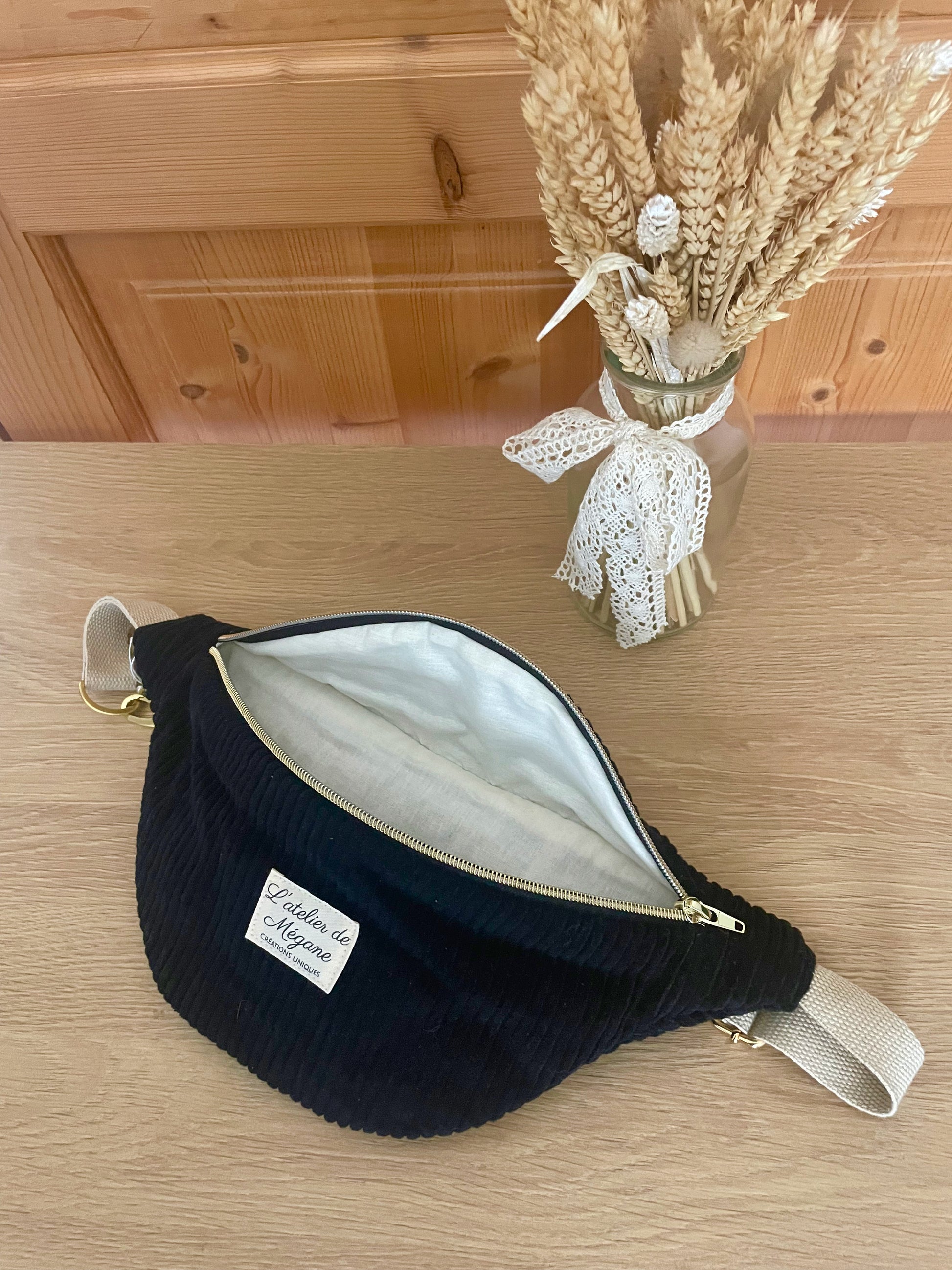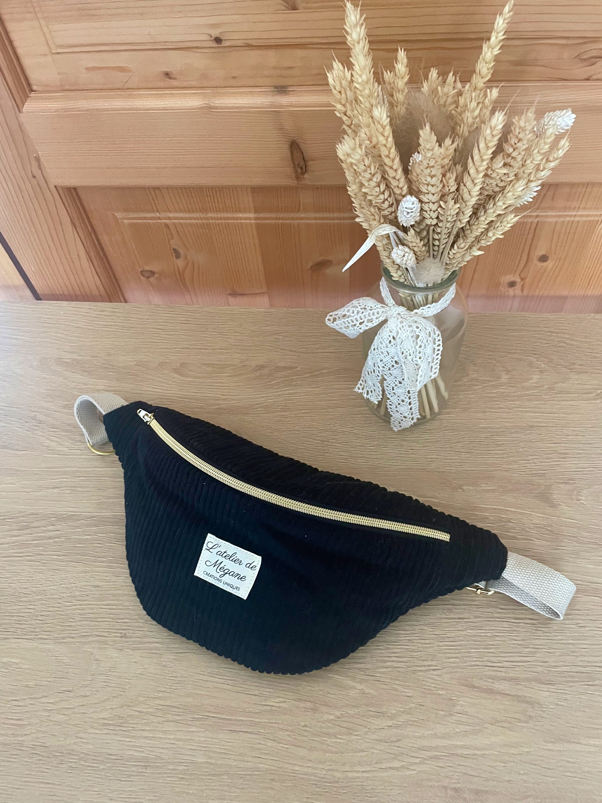 Banane taille classique réalisée en velours côtelé fin noir et coton uni beige.