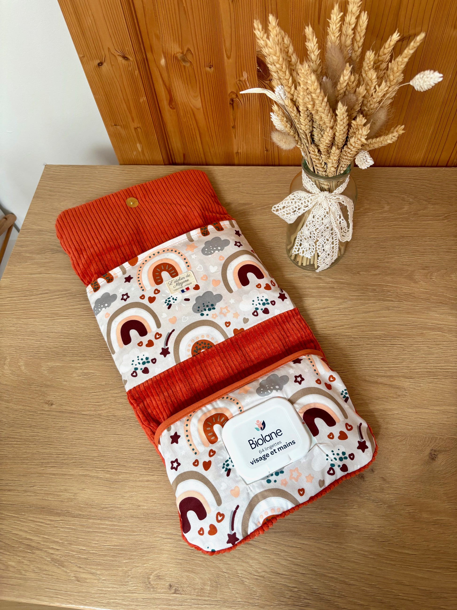 Ma pochette à langer nomade vous accompagne partout, de la balade au rendez-vous chez le pédiatre. Pensée pour rester compacte et bien organisée, elle accueille couches et lingettes dans deux compartiments séparés afin d’avoir tout sous la main au moment de changer bébé. Je la couds à la main, avec des matières douces et durables, pour un accessoire pratique, élégant et fait pour durer.